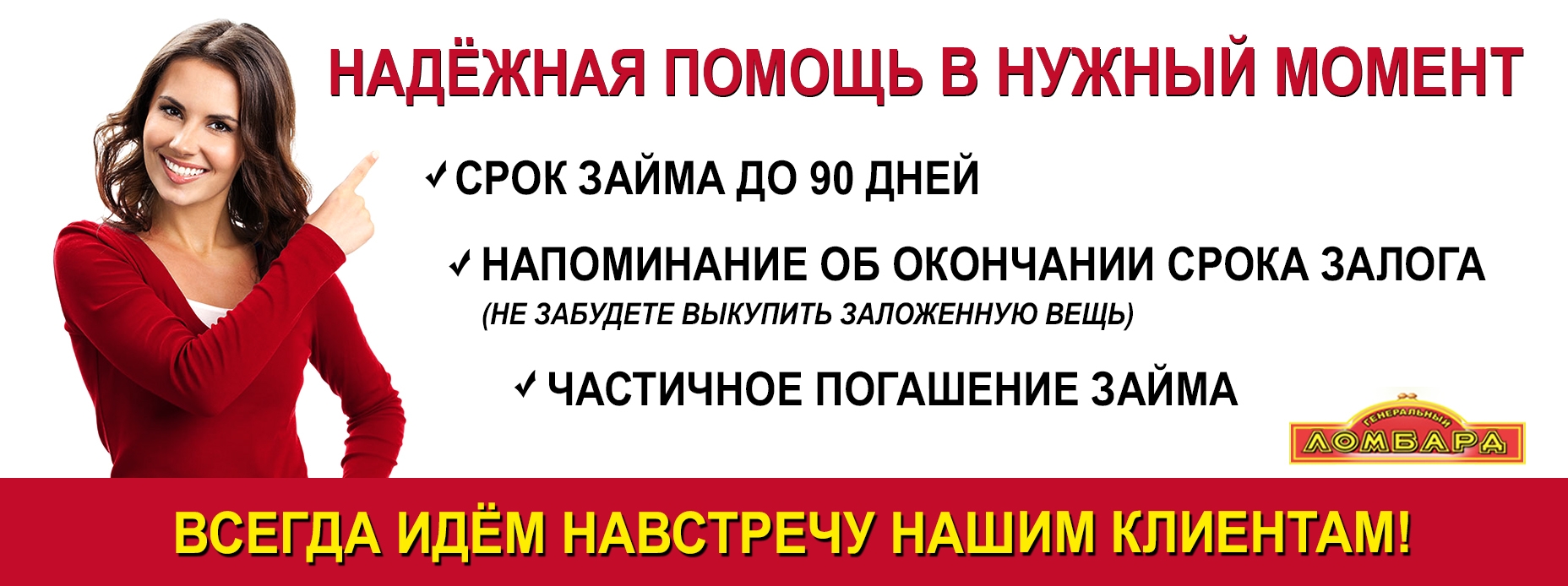 Залог в «ЛОМБАРДЕ «ГЕНЕРАЛЬНОМ» - вот правильное решение! Выгодные условия займа, надёжность, конфиденциальность, квалифицированный персонал, индивидуальный подход к каждому клиенту – вот, за что нас любят.